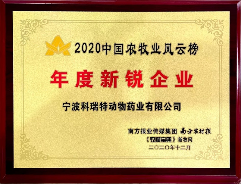 2020年12月11日,由南方報業(yè)傳媒集團(tuán)、南方農(nóng)村報社、廣東省鄉(xiāng)村振興文化服務(wù)產(chǎn)業(yè)園主辦,農(nóng)財寶典、新牧網(wǎng)、牛羊?qū)毜涑修k的中成藥業(yè)特約?2020第十屆中國農(nóng)牧業(yè)風(fēng)云會在廣州盛大舉行。經(jīng)過前期激烈的網(wǎng)絡(luò)投票,以及專家、金牌服務(wù)商、協(xié)會、種豬場評委綜合評選,寧波科瑞特動物藥業(yè)有限公司當(dāng)選2020年中國農(nóng)牧業(yè)風(fēng)云榜“年度新銳企業(yè)”。