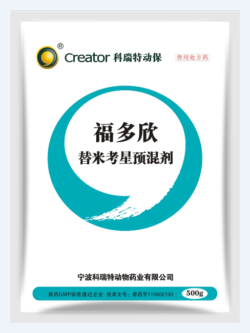 福多欣的主要成分為替米考星,屬于半合成大環(huán)內(nèi)酯類抗生素,其抗菌譜與泰樂(lè)菌素相似,而抗菌效力強(qiáng)于泰樂(lè)菌素。