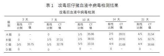 從試驗(yàn)結(jié)果可見:陰性對照組全程血清PRRSV CT值陰性,而陽性對照組每3天有3頭陽性,第7天全部轉(zhuǎn)為陽性,說明攻毒造模劑量是合適的。