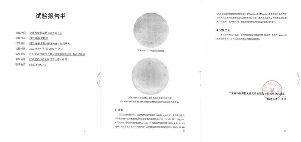 為探尋園蘭清對PRRSV的作用機理,公司委托廣東省動物源性人獸共患病預防和控制重點實驗室進行了園蘭清體外抑制PRRSV病毒的試驗。