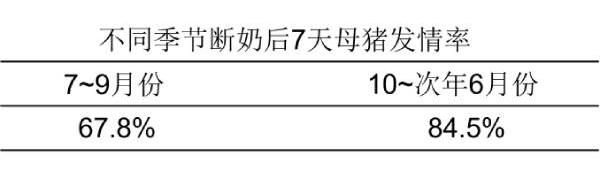 1.1 溫度對斷奶7天內(nèi)母豬發(fā)情率影響見下表(引用資料)。