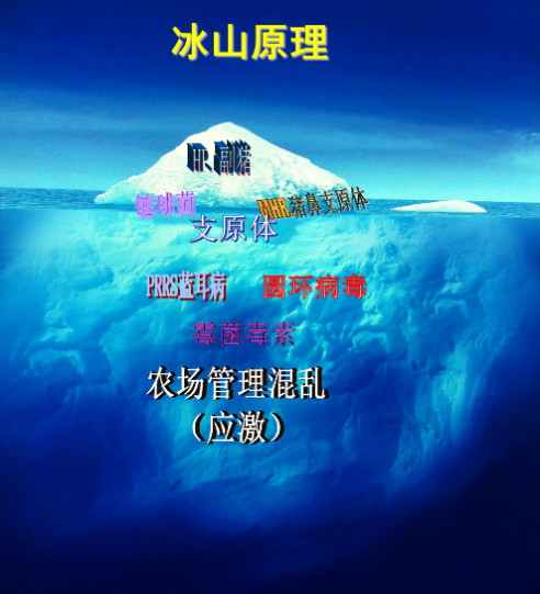 曾經(jīng)盛行的一種說(shuō)法,叫冰山理論,用來(lái)闡述細(xì)菌病與以上三大因素的關(guān)系。即海面上看到的冰山,只有其真實(shí)大小的20%(實(shí)際上根據(jù)冰與水的密度計(jì)算,遠(yuǎn)不足20%),在海水的下面尚有80%。在豬病上的體現(xiàn)就是,你看到的副豬、鏈球菌、胸膜肺炎等細(xì)菌性病原,在疾病中重要性只占20%,發(fā)生這些疾病的根本原因(看不見的部分),其重要性占80%。而這80%,才是豬只健康管理的核心。